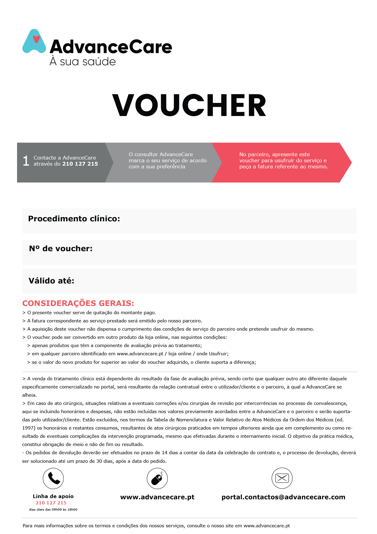 1. A AdvanceCare e/ou os Parceiros não são responsáveis por vouchers, ou referências de vouchers, não utilizados, perdidos, destruídos ou roubados.
